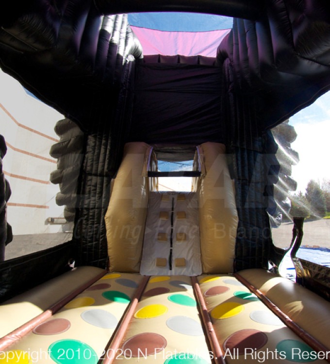 It stands 33 ft long, by 13 ft wide and is just over 25 ft tall. It has a giant bounce area and a climbing wall which leads to a slide. This is easly one of the most unique and cool bounce combos out today.