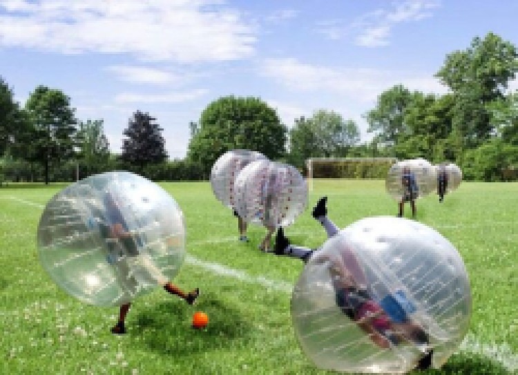 Bubble Soccer balls are a single chamber inflatable sphere with inner handles and adjustable shoulder straps. Bubble Soccer can be used singularly to perfect your rolls, flips, and wheels. "Bubble Soccer" describe the sensation as almost defying gravity, just imagine the sensation and mobility that a Bubble Soccer allows you to experience without putting any stress on the body. We suggest 5 on 5 game of "Knocker Soccer" on a gym floor, a grassy field, or consider the Human Foosball arena with the goals already in place.